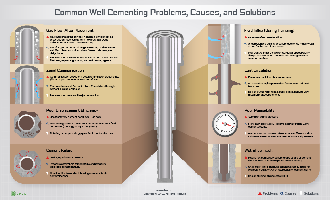 Many well cementing challenges occur out of sight during the cementing process. To help visualize these hidden issues, we created an infographic highlighting the most common cementing obstacles—from formation-related problems to shoe track complications—along with their causes and potential solutions.